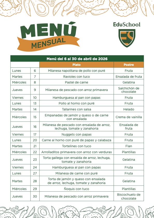 Para acceder al menú diario, deberán abonarlo o anotarse en administración con Mauricio Melgarejo en el horario de 8:15 a 10:30 personalmente o telefónicamente al 21702572 int.303 o vía mail a mmelgarejo@eduschool.edu.uy.